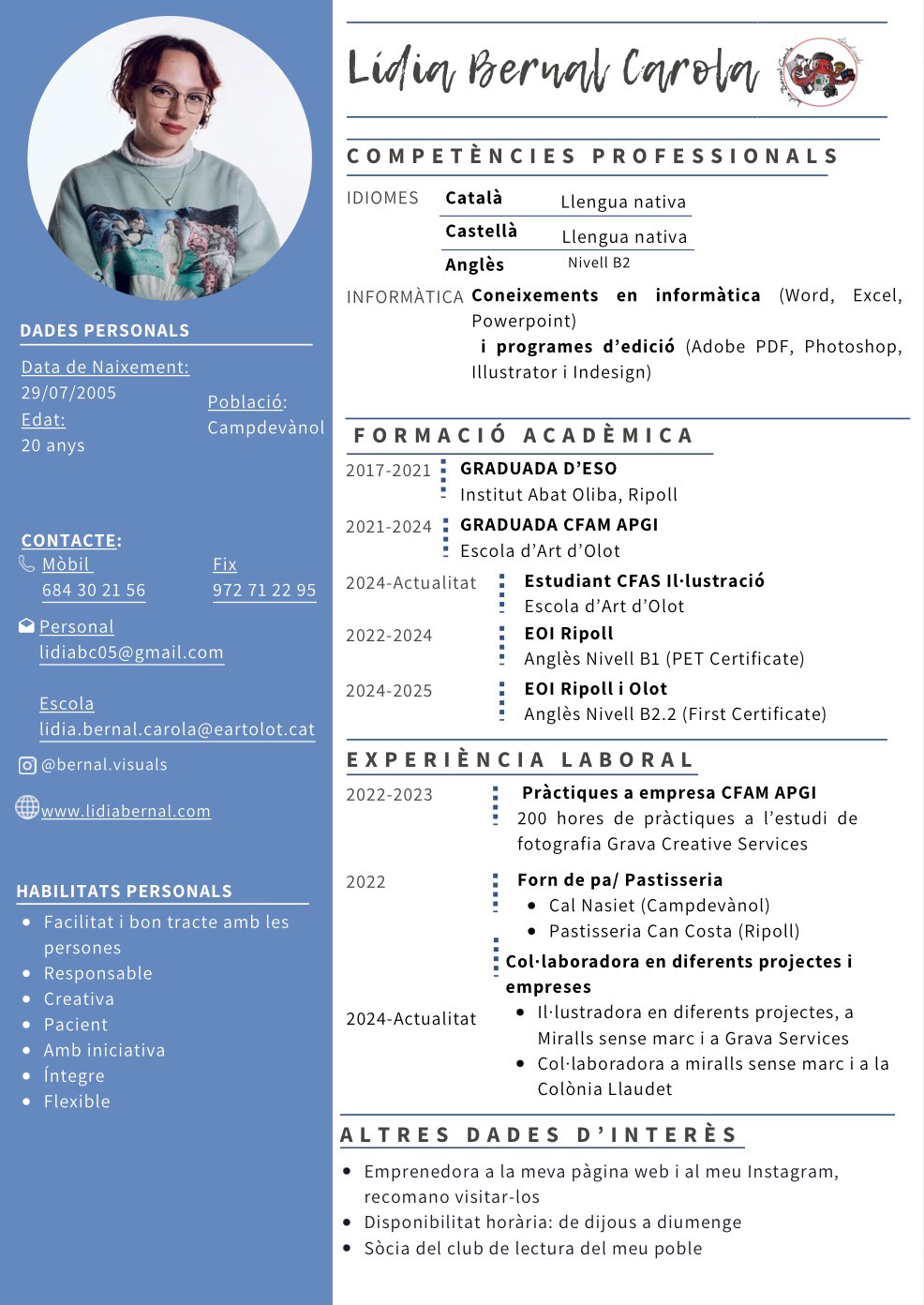 - Titulada en Cicle Formatiu de Grau Mitjà d'Assistència al Producte Gràfic Imprès, amb experiència en pràctiques a empresa (200 h. a l'estudi de fotografia Grava Creative Services).