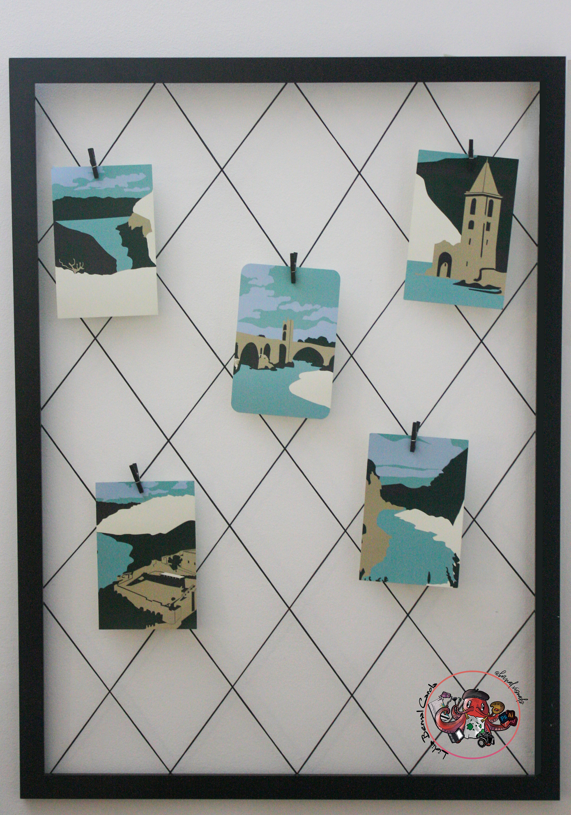 El repte personalment per a mi ha estat conservar una mateixa temàtica i una mateixa paleta cromàtica, és a dir, cada postal com a màxim podia tenir 6 colors, que havien de ser els mateixos en totes les postals.