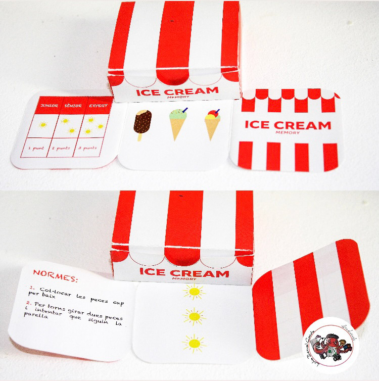 Aquest projecte també forma part de l'assignatura d'Autoedició d'Illustrator on l'activitat consistia en crear un joc de memòria i observació visual a través d'un objecte. Aquest objecte ha de tenir 3 nivells de dificultat, per la qual cosa, juntament amb la meva companya Laura, vàrem decidir que nosaltres utilitzaríem un gelat. Així que també vàrem fer l'embalatge ambientat en un carret de venda de gelats