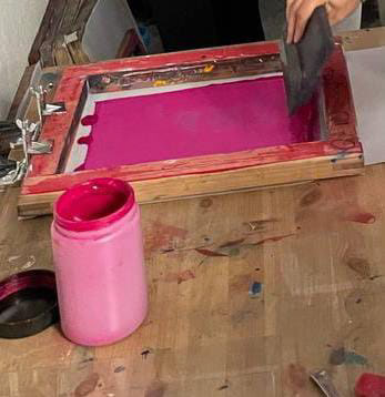 En el viatge de final de curs de 1r a Madrid vaig assistir en un taller d'estampació serigràfica amb la resta dels meus companys i amics. Va ser tot un repte per a mi perquè va ser la meva primera vegada utilitzant la tècnica de la serigrafia, en aquest cas amb tinta Magenta.