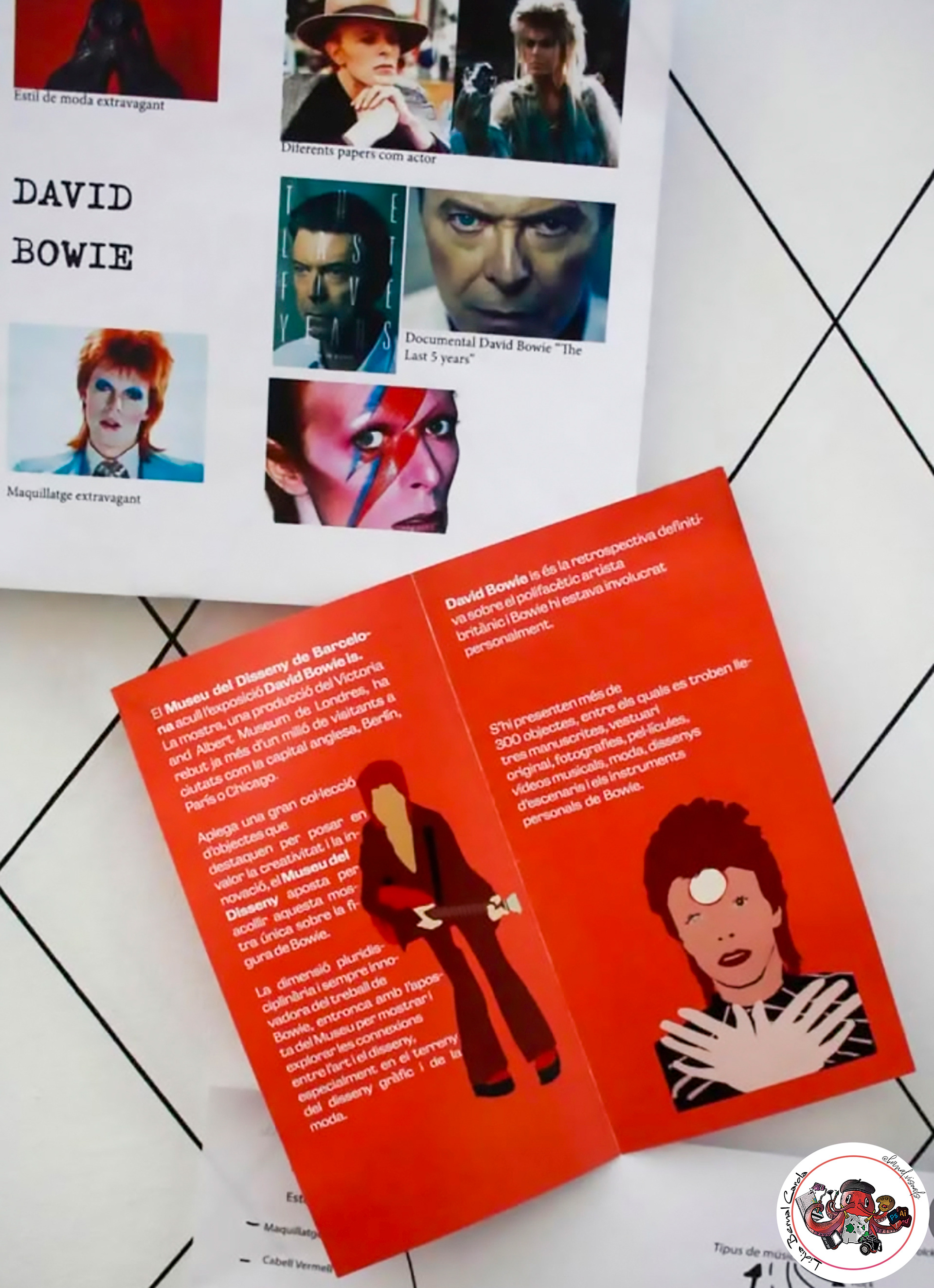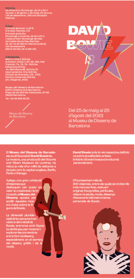 Aquest projecte forma part de l'assignatura d'Autoedició d'InDesign que es cursa en el segon any del cicle, on havíem de recrear un díptic informatiu per una exposició de David Bowie en el Museu del Disseny de Barcelona.